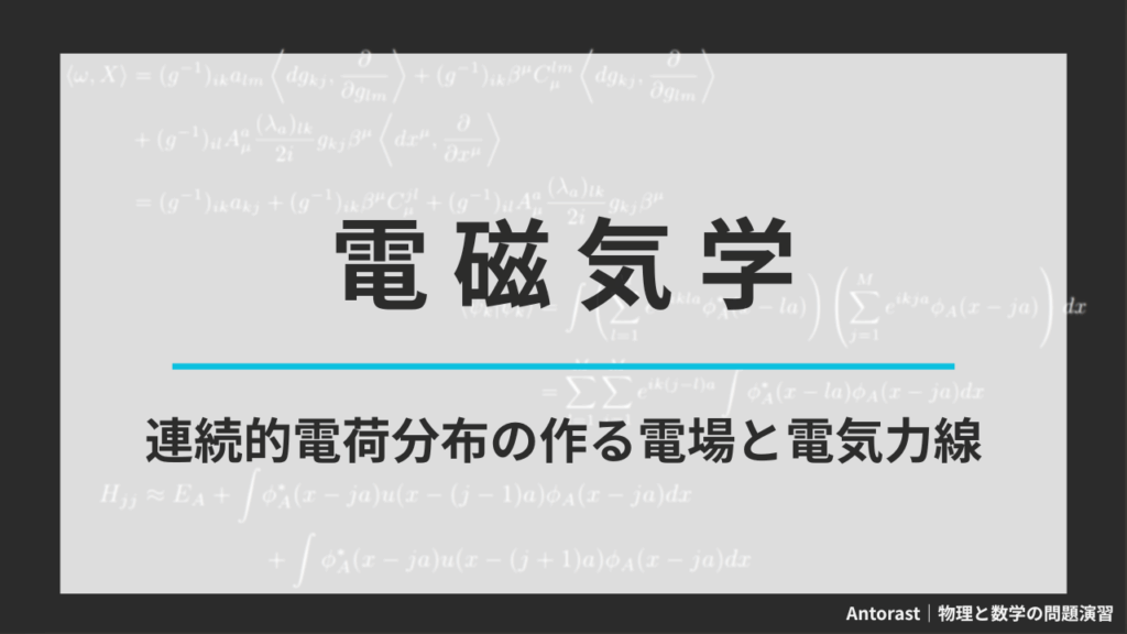 連続的電荷分布のつくる電場の計算方法と電気力線の性質や基本事項についてまとめました。 電磁気学