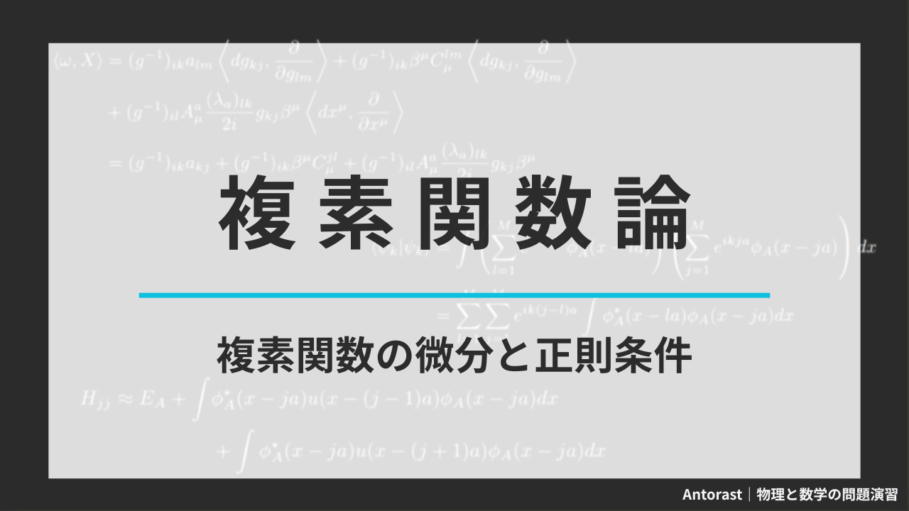 複素関数の微分 \[f'(z)=\lim_{\Delta z \to 0}\frac{f(z +\Delta z)-f(z)}{\Delta z}\] と複素関数の正則条件についてまとめます。