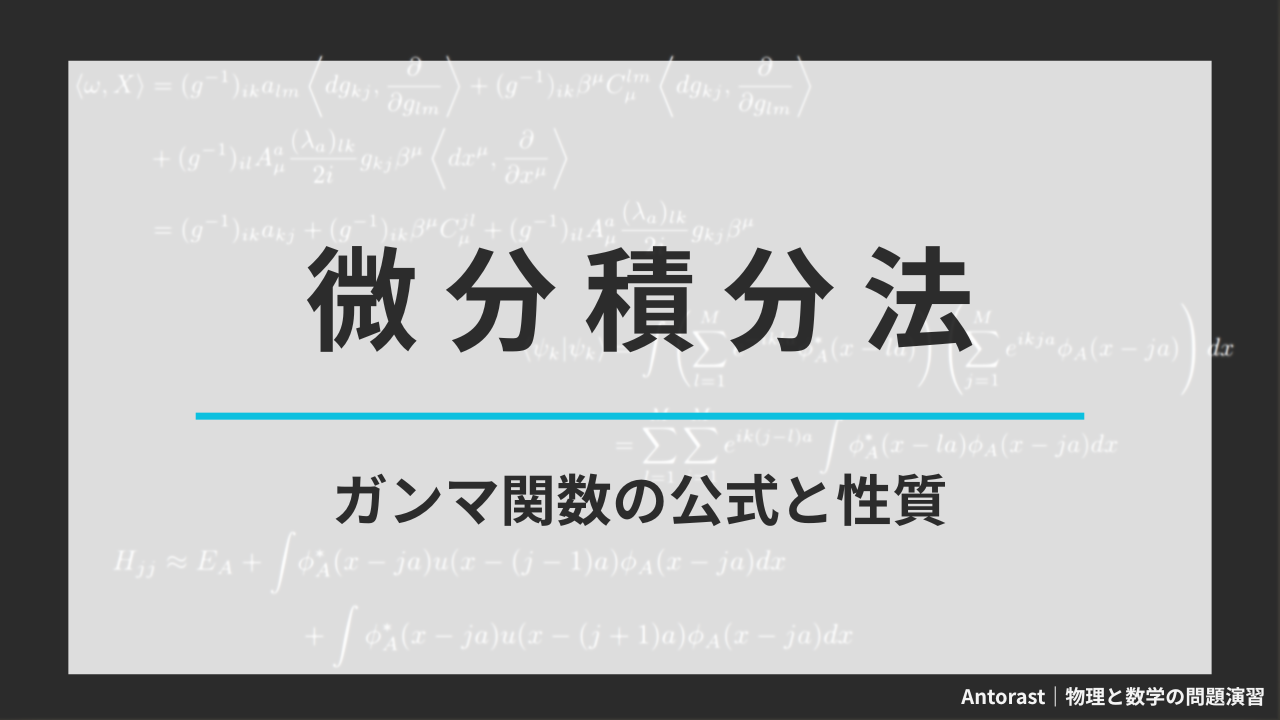 $\textrm{Re} (z)>0$ を満たす複素数 $z$ に対し\[\Gamma (z)=\int_{0}^{\infty}e^{-z} t^{z-1}dt \] で定義される $\Gamma (z)$ をガンマ関数という。